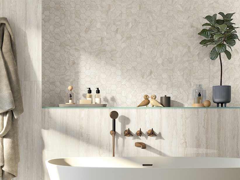 Dans ces trois variantes de la collection Vogue est également disponible la mosaïque hexagonale, qui peut être utilisée autant avec le carrelage 60x120, que seule ou coordonnée à d’autres produits – parquet, grès cérame effet pierre ou effet bois – pour valoriser un pan de mur, une alcôve, créer une douche à l’Italienne ou réaliser une surface sobre mais résolument décorative.