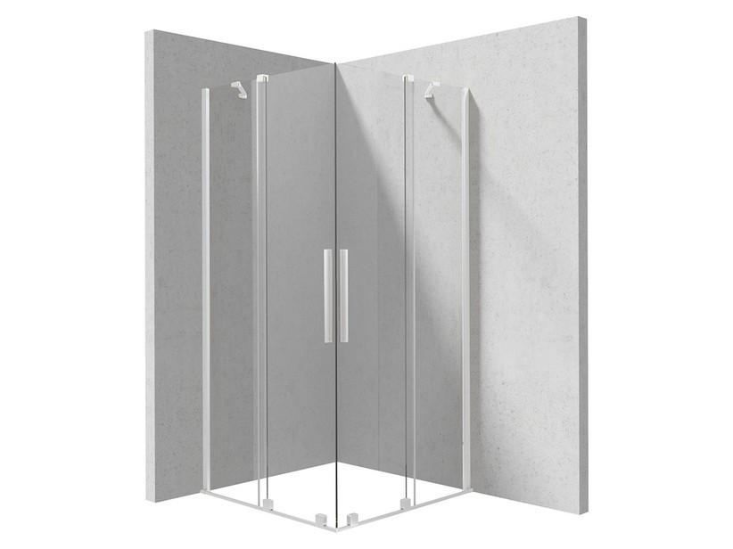 PRIZMA : Cabine de douche d'angle avec portes coulissantes sur rail au sol 90x140 cm H195 cm réversible. Extensibilité 88-90/138-140 cm, verre épaisseur 6 mm transparent avec traitement anticalcaire Active Cover, poignée en aluminium et profilés blanc mat. Barre stabilisatrice 120 cm découpable, barre angulaire et raccord en T inclus.