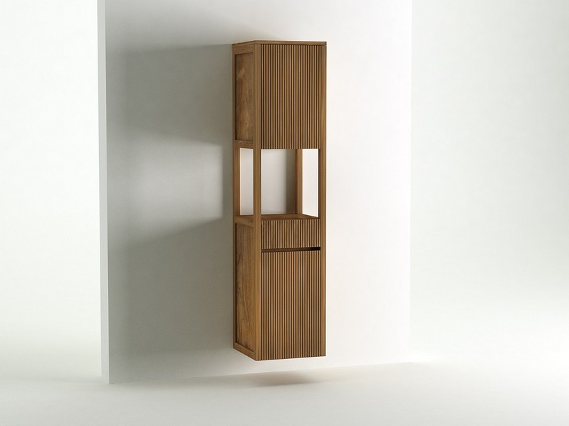 LOMBOK Colonne de salle de bains suspendue L40xP40xH171 cm avec 2 portes à fermeture ralentie, 1 tiroir et 1 compartiment ouvert en bois naturel massif de Teck, design minimaliste avec finition cannelée verticale - finition Teck naturel