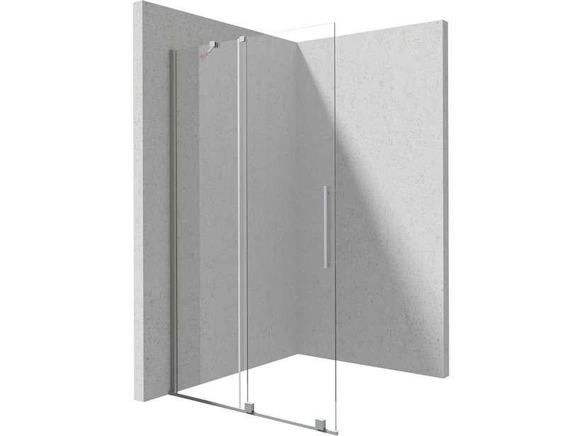 PRIZMA : Douche à l'italienne avec porte coulissante sur rail au sol 90 cm H195 cm réversible. Extensibilité 88-90 cm, verre épaisseur 6 mm transparent avec traitement anticalcaire Active Cover, poignée en aluminium et profilés effet inox brossé. Barre stabilisatrice 120 cm découpable, barre angulaire et raccord en T inclus. Installation en niche également possible.