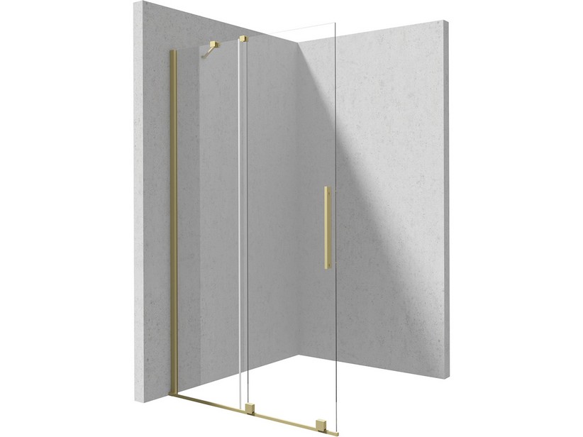 PRIZMA : Douche à l'italienne avec porte coulissante sur rail au sol 90 cm H195 cm réversible. Extensibilité 88-90 cm, verre épaisseur 6 mm transparent avec traitement anticalcaire Active Cover, poignée en aluminium et profilés or brossé. Barre stabilisatrice 120 cm découpable, barre angulaire et raccord en T inclus. Installation en niche également possible.