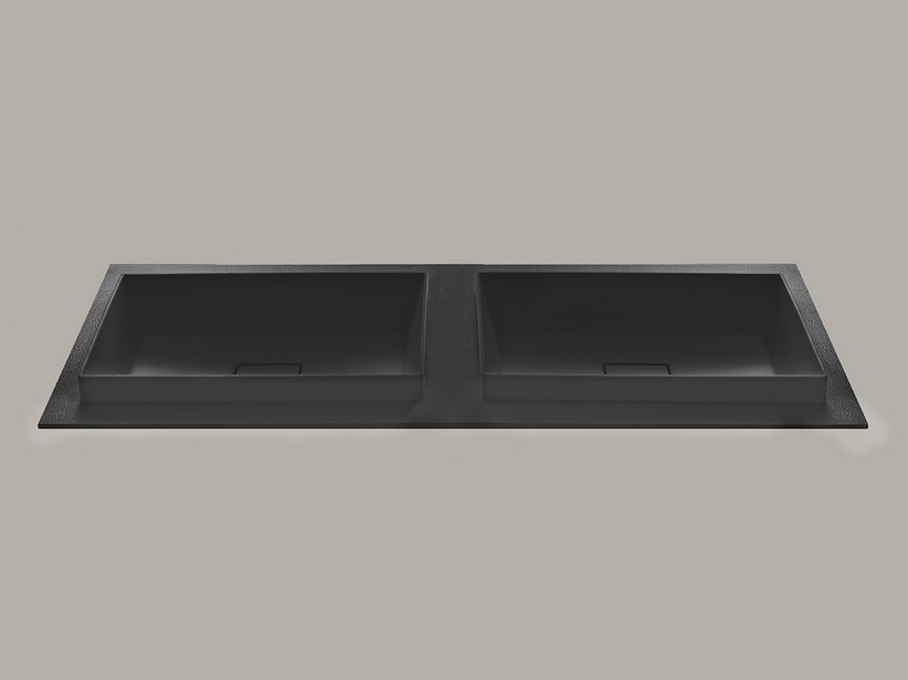 STAR PIETRA : Lavabo Unitop en résine 140,5x51,5 cm avec double vasque semi-encastrée et cache-bonde en résine ton sur ton - sans trou pour trop-plein - sans trou pour mitigeur (avec prédisposition de 1 ou 3 trous) - finition du plan effet pierre bouchardée noir semi-brillant.