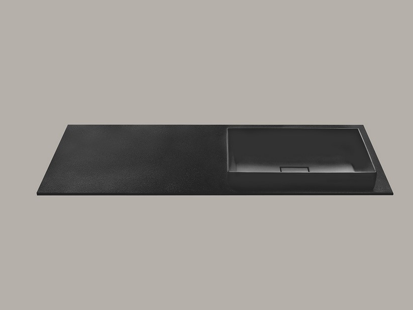 STAR PIETRA : Lavabo Unitop en résine 140,5x51,5 cm avec vasque semi-encastrée à droite et cache-bonde en résine ton sur ton - sans trou pour trop-plein - sans trou pour mitigeur (avec prédisposition de 1 ou 3 trous) - finition du plan effet pierre bouchardée noir semi-brillant.