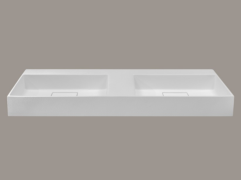 QUADRO Lavabo Unitop en résine avec double vasque intégrée cm. 140x48 H12 prédisposition pour mitigeur 1 ou 3 trous, cache-bonde de finition inclus - finition blanc semi-brillant effet pierre bouchardée