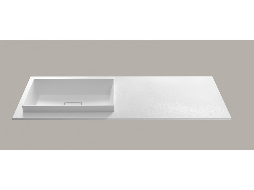STAR : Lavabo Unitop en résine 120,5x51,5 cm avec vasque semi-encastrée à gauche et cache-bonde en résine ton sur ton - sans trou pour le trop-plein - sans trou pour le mitigeur (avec prédisposition 1 ou 3 trous) - finition blanc semi-brillant effet pierre bouchardée.