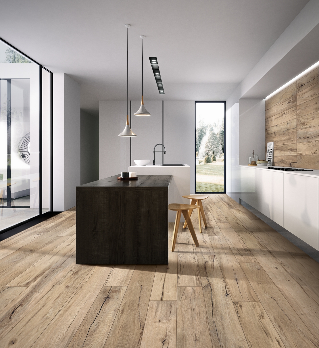 La cuisine américaine peut être interprétée de différentes manières en fonction du style que vous souhaitez créerÀ travers un choix judicieux de matériaux, de design et d'accessoires, il est possible de donner à cet espace une touche spécifique. Si le désir est de créer une cuisine américaine classique, des matériaux tels que le bois et la céramique, ainsi que des accessoires traditionnels, contribuent à créer une ambiance familiale et décontractée. Pour une cuisine américaine de style industriel, un rôle important est joué par les sols et les revêtements : pour les premiers, vous pouvez opter pour des carreaux de grès de grand format effet béton, posés sans joint pour restituer l'effet de continuité typique du véritable béton.