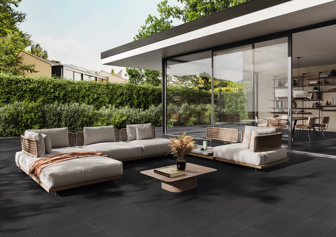 Comme mentionné précédemment, le grès cérame noir est adapté non seulement pour l'intérieur mais aussi pour l'extérieur. Pour la Revêtement de terrasses, balcons et coursLe grès cérame est parfait pour une finition effet pierre, un matériau d'inspiration naturelle et adapté aux espaces extérieurs. Les carreaux de grand format en grès effet pierre noire contribuent à créer des environnements extérieurs au style contemporain à décorer avec des meubles au design essentiel mais confortable. De plus, grâce à sa couleur sombre, ce revêtement s'intègre de manière fluide et harmonieuse dans un environnement naturel.